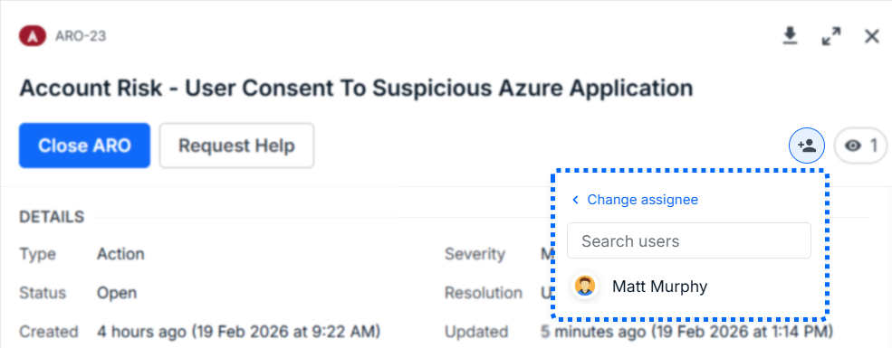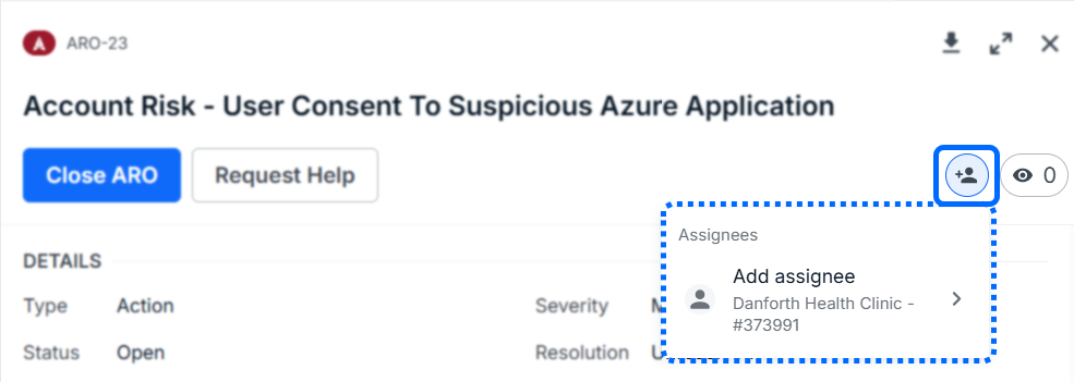 To assign an ARO, click the Assignee icon in the upper right of an ARO’s Title section. Then click on the No Assignee + label to add an assignee.