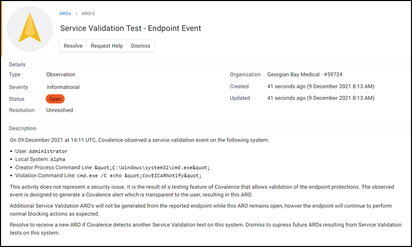 These validation rules are designed to only allow one ARO for each endpoint to be active at a time. While the endpoint will behave as expected (blocking, terminating), running an additional test command won’t generate a new ARO if an existing Service Validation Test ARO is open, or has been previously dismissed, for that endpoint.