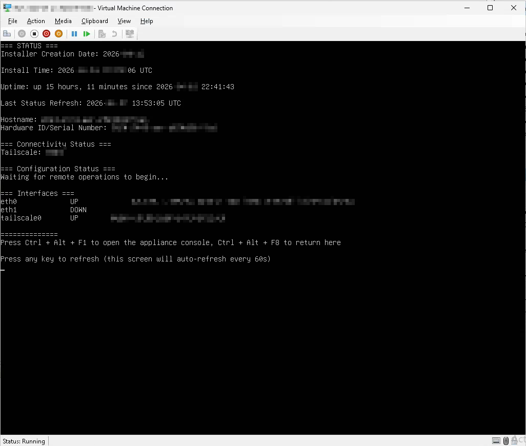 At the end of the process, you will see a confirmation screen that displays information about the appliance. Ensure that the connectivity status is active and connected. If you have any issue with the connections, use Ctrl+Alt+F1 to open the appliance console to investigate further.