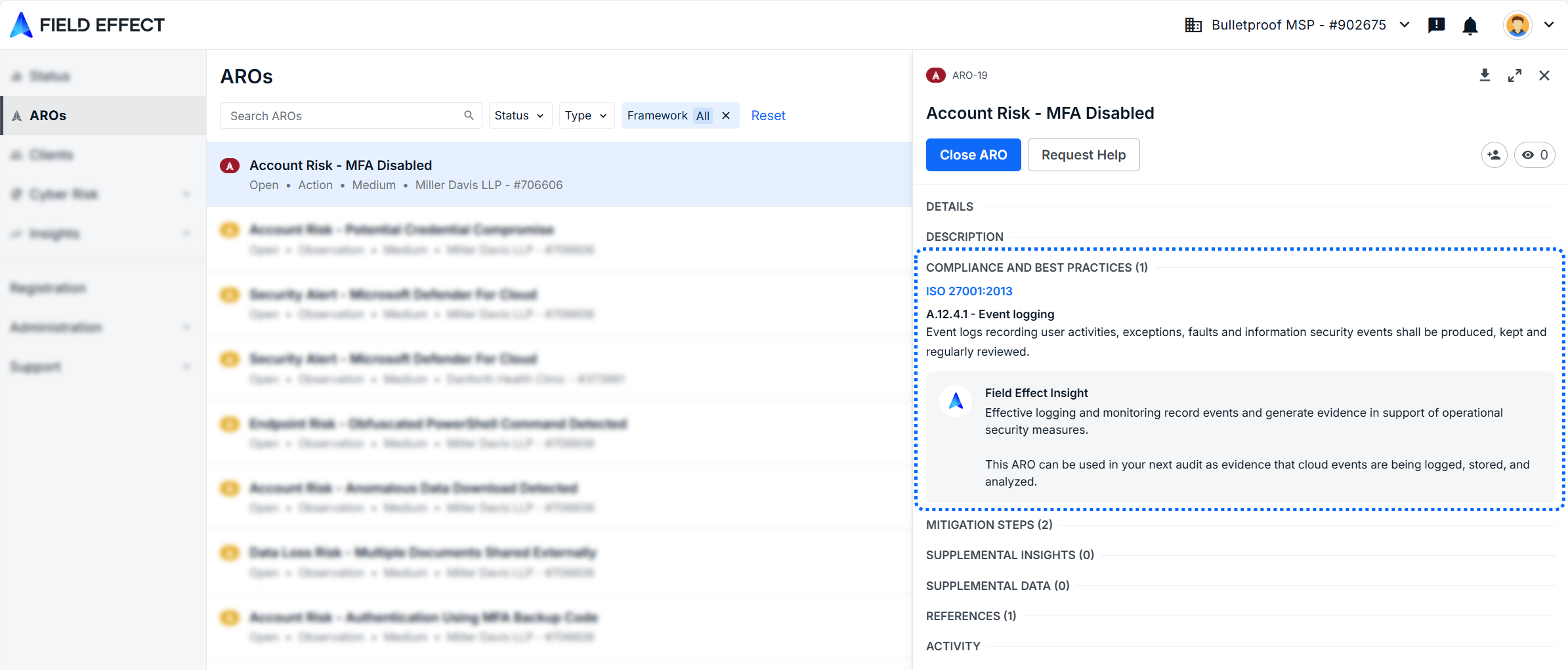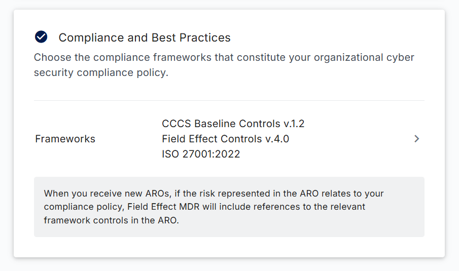 Some of the AROs you receive may impact your organization’s compliance with a given framework, and Field Effect MDR can map AROs to any compliance controls they affect. This article covers the following:
