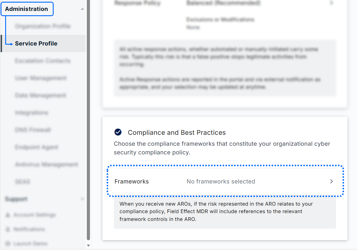 Navigate to the sidebar’s Service Profile page (Administration section). In the Compliance and Best Practices card, click the Frameworks button.