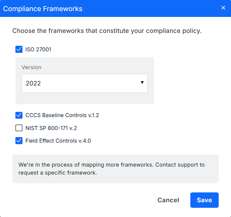 The Compliance Frameworks window will appear on your screen. Select the compliance framework(s) you want to map to and click Save.