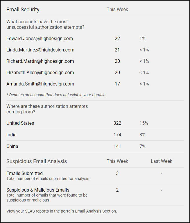 The Email Security section of your Monthly report provides a breakdown of which email accounts were accessed most frequently, as well as from which countries authorization attempts were attempted.