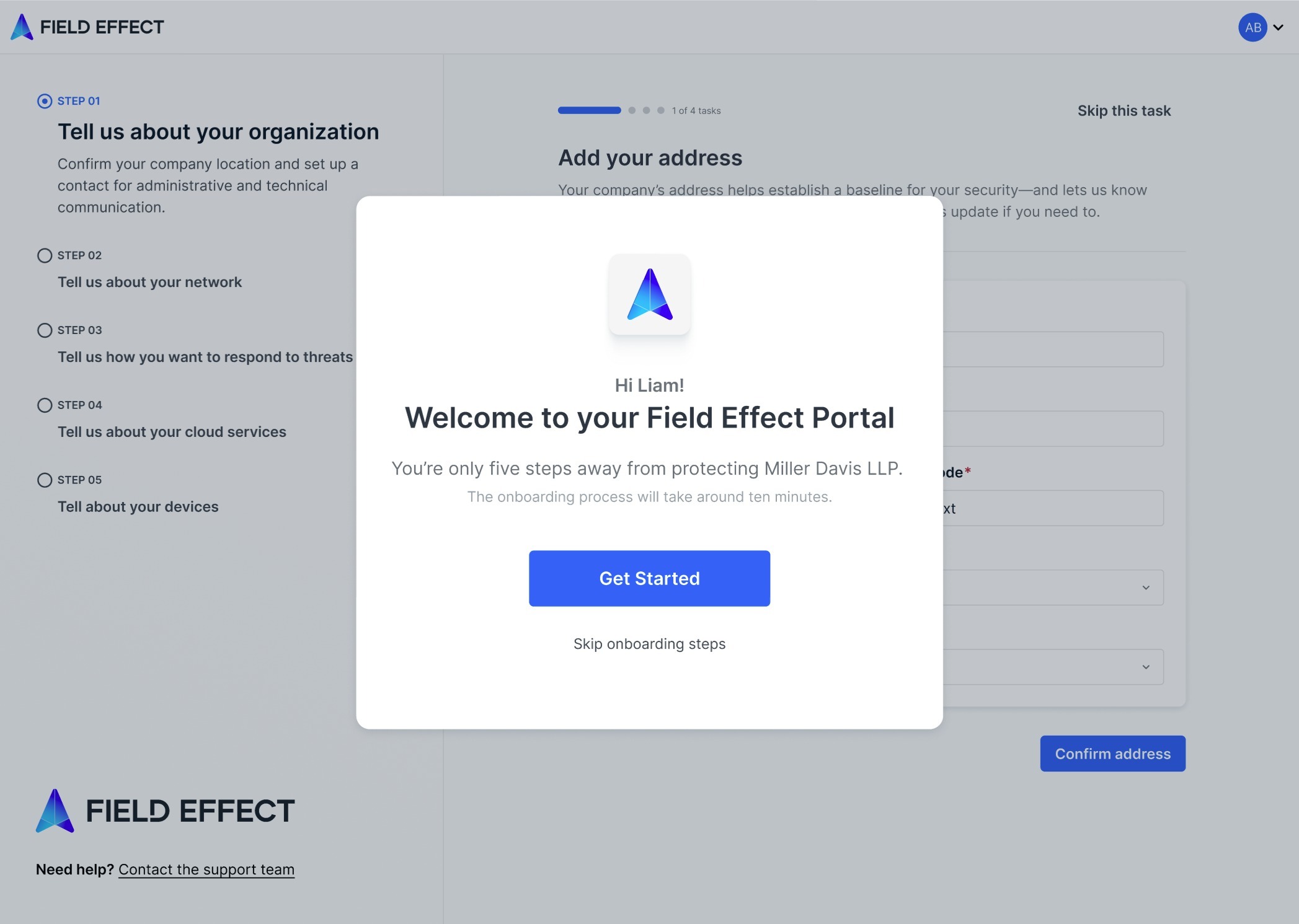 If you do not want to use the onboarding wizard, Field Effect has extensive video and text documentation on all aspects of setting up a new client with MDR services in our Help Center. If you have any further questions or challenges, our Support team will be happy to assist you.