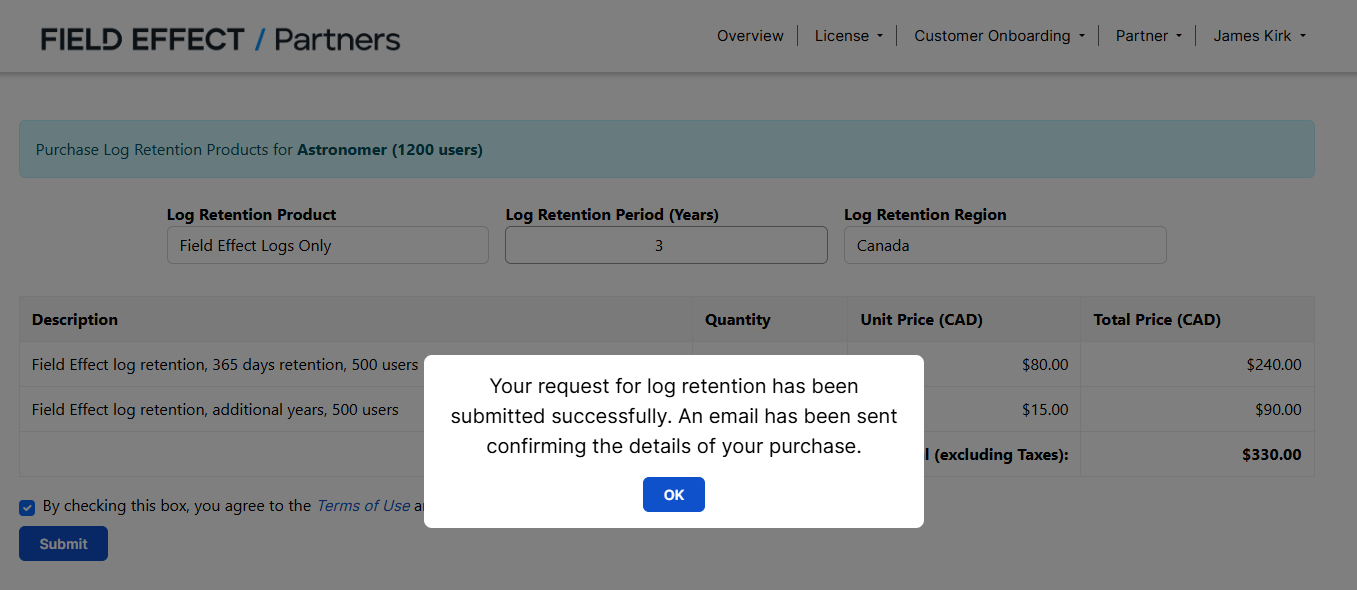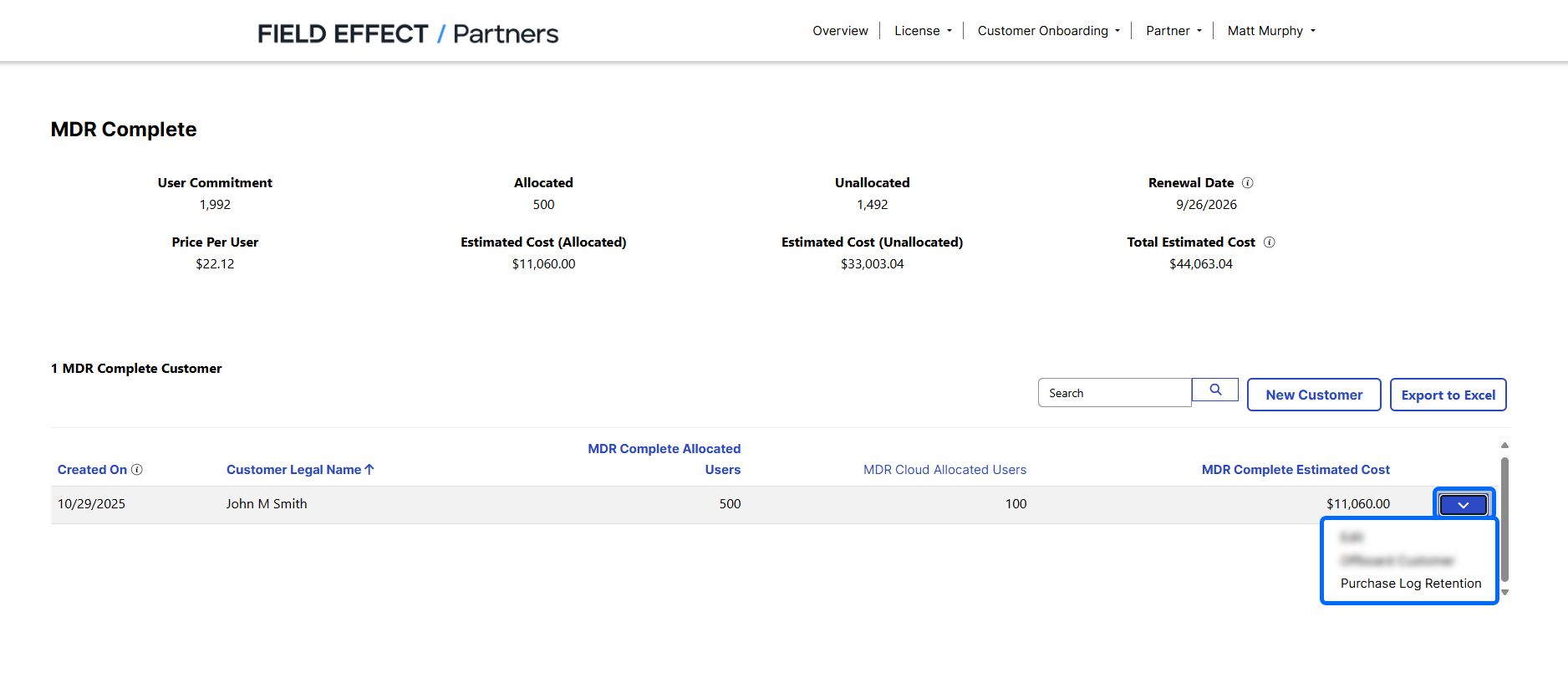 After logging into the LMP, navigate to the MDR Complete License page and expand the client's dropdown menu. Select Purchase Log Retention.