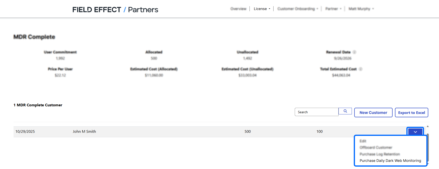 After logging into the LMP, navigate to the MDR Complete License page and expand the client's dropdown menu. Select Purchase Daily Dark Web Monitoring.