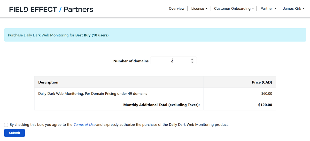 You'll be taken to the purchase page. Select the number of domains for the client, agree to the terms, and click Submit.