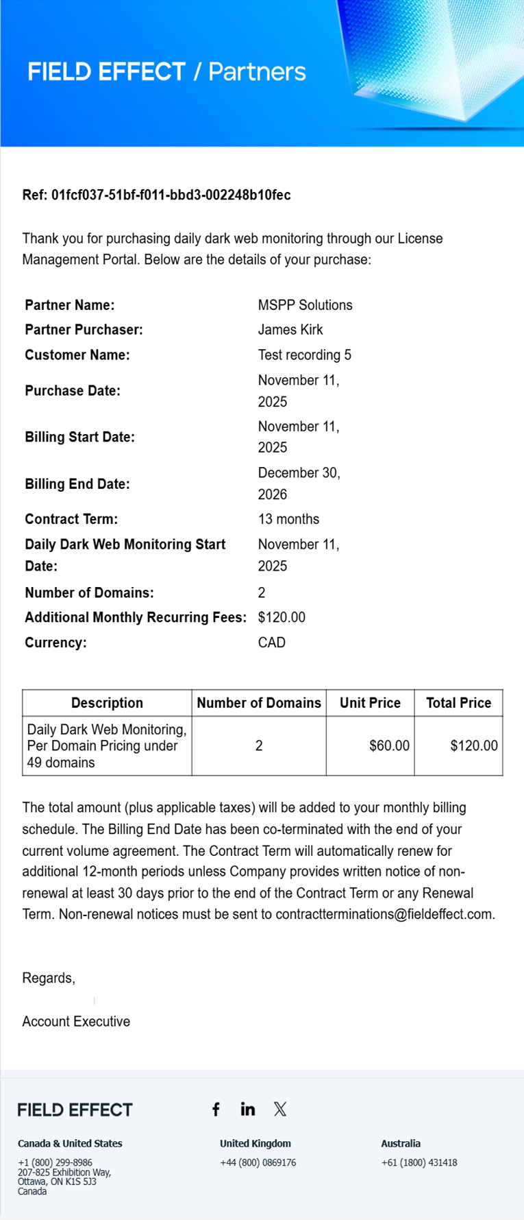 Daily Dark Web monitoring is available as an add-on purchase for MDR Complete clients in LMP. This article walks through the process of purchasing the add-on for a client. For more on Field Effect's Dark Web Monitoring, see our overview article.