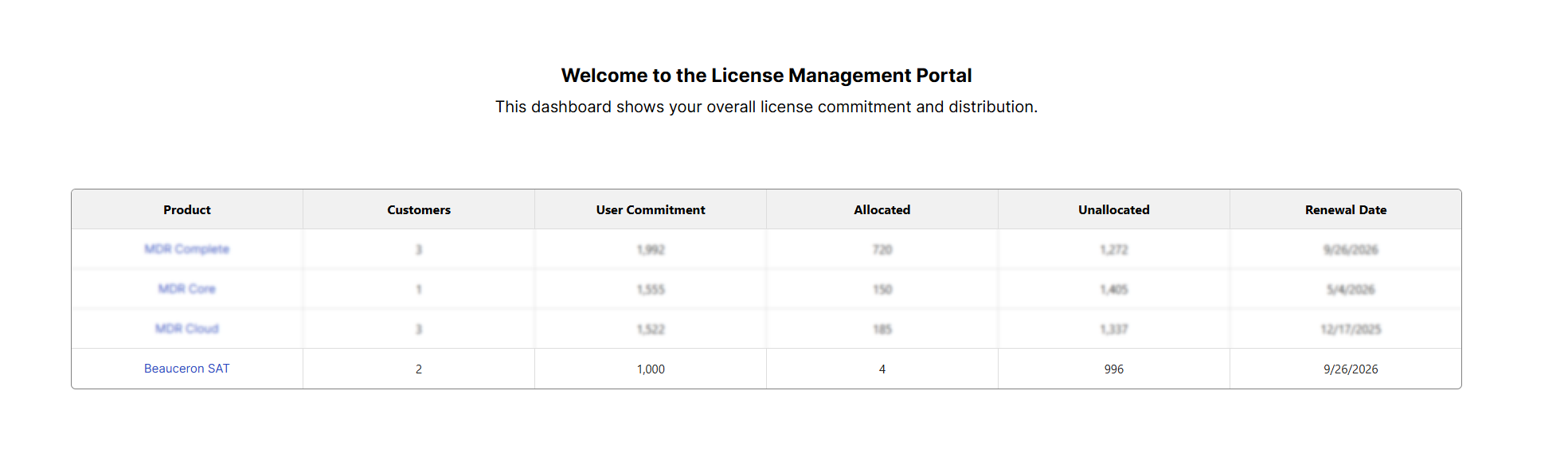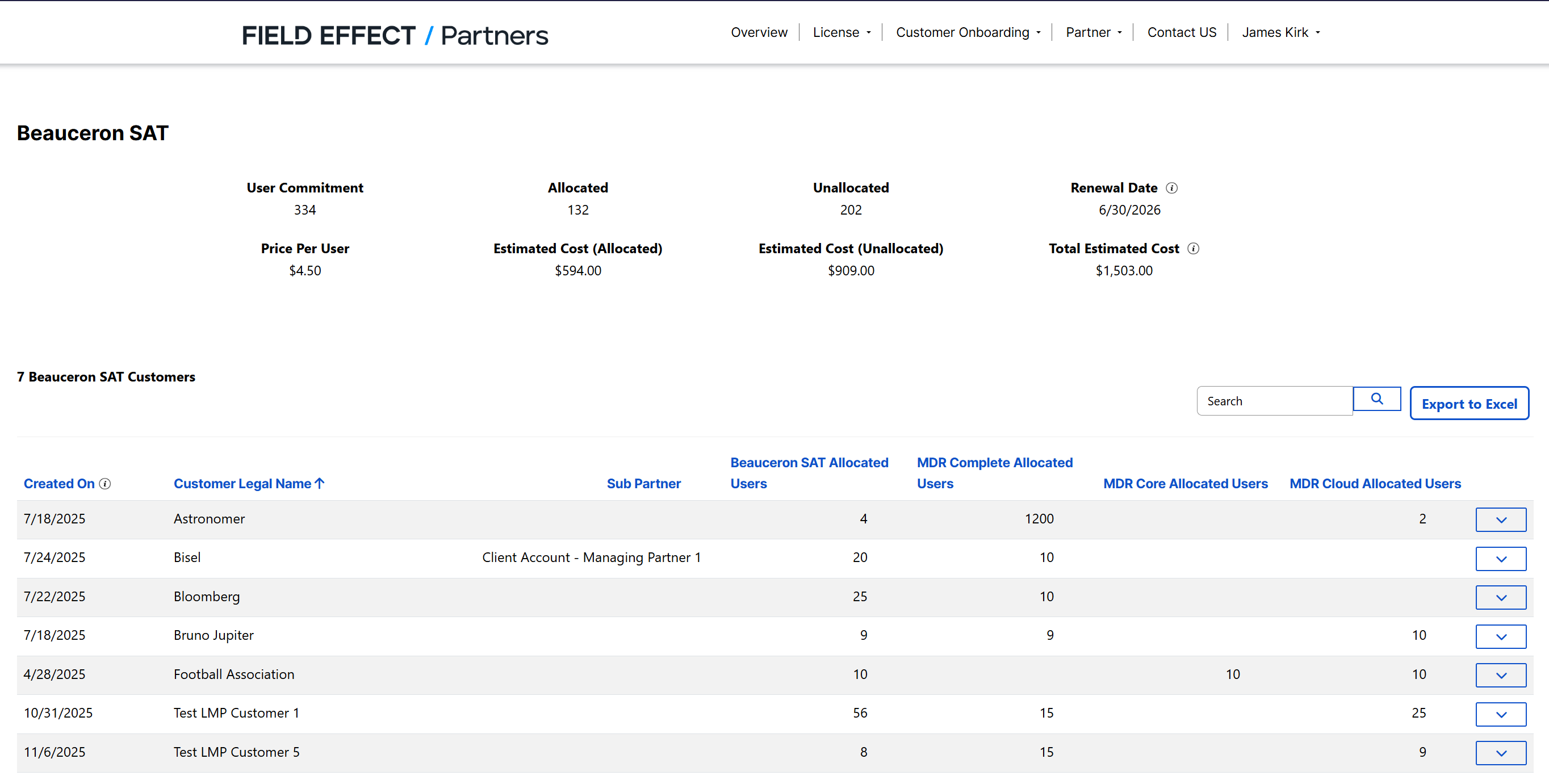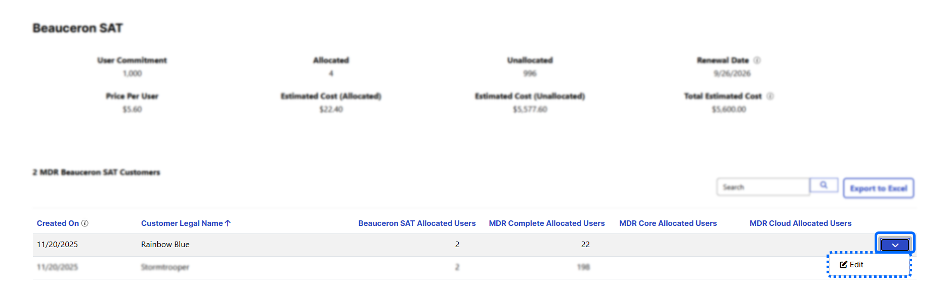 This will take you to the Beauceron SAT page that lists all the clients who have the add-on feature. There is also an overview section that gives a breakdown of your seat allocations, costs, and renewal dates.