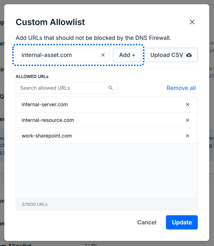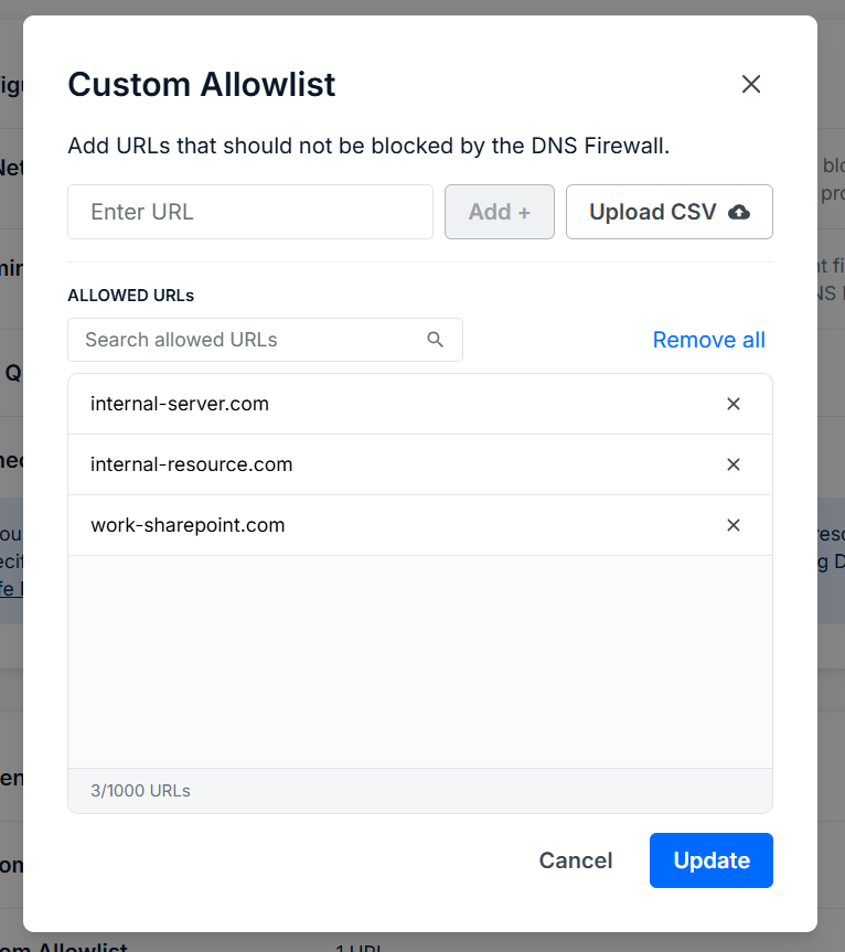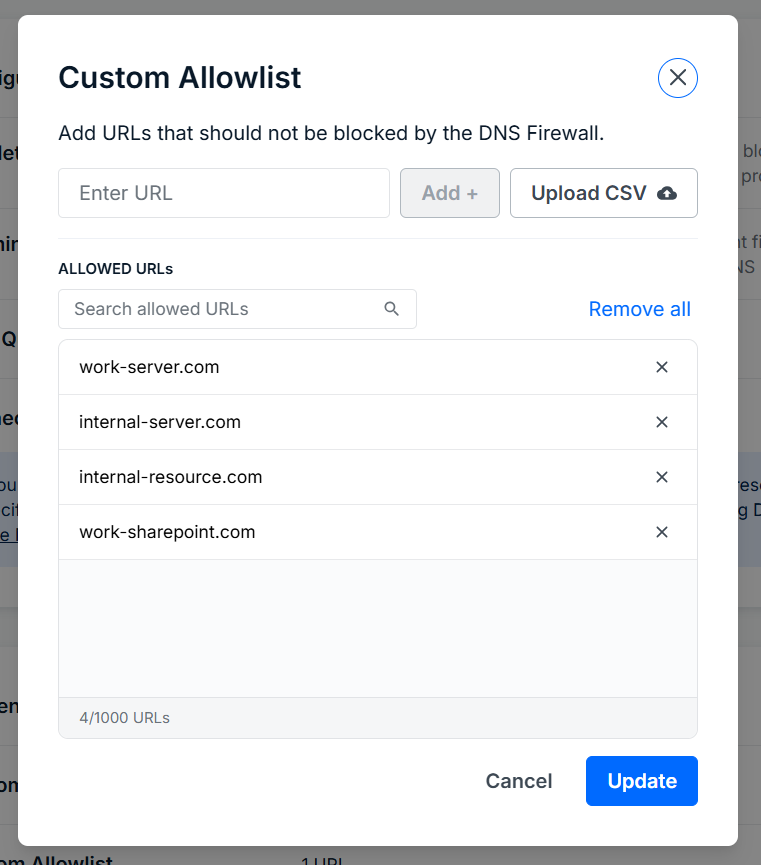 You’ll be taken back to the DNS Firewall tab, and the number of URLS in the Custom Allowlist section will reflect the update.