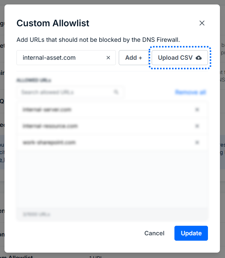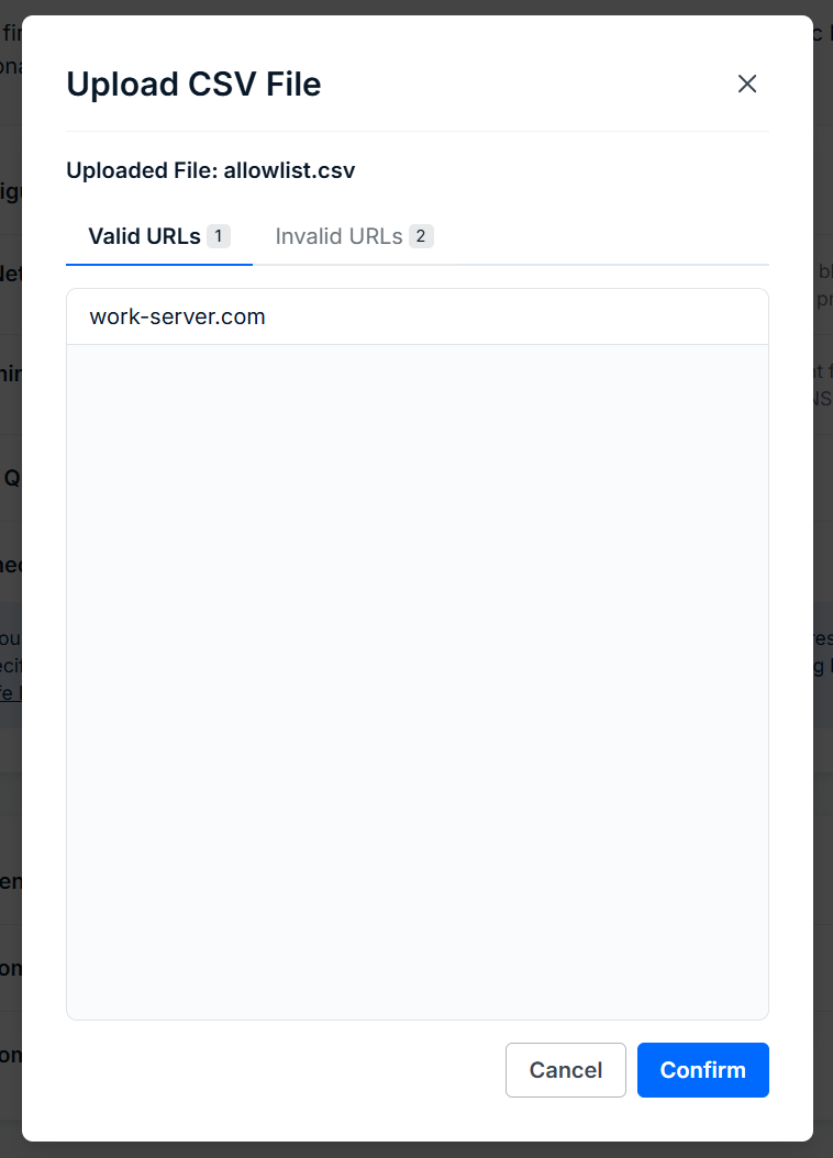You can add single URLs to the allowlist manually, or you can upload a .csv file containing up to 1000 URLs.
