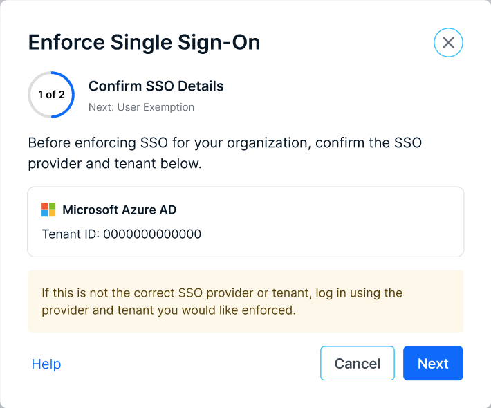 You'll be taken back to the main page, and the SSO Enforcement card will be updated to show the SSO Provider being enforced and the number of exempted users.