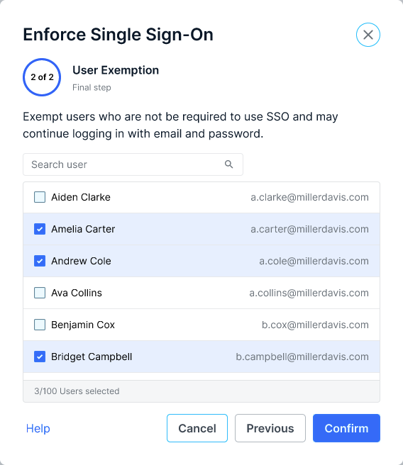 You'll then have the opportunity to exclude users from SSO Enforcement. Any user checked in this list will be able to continue logging in with their email and password.