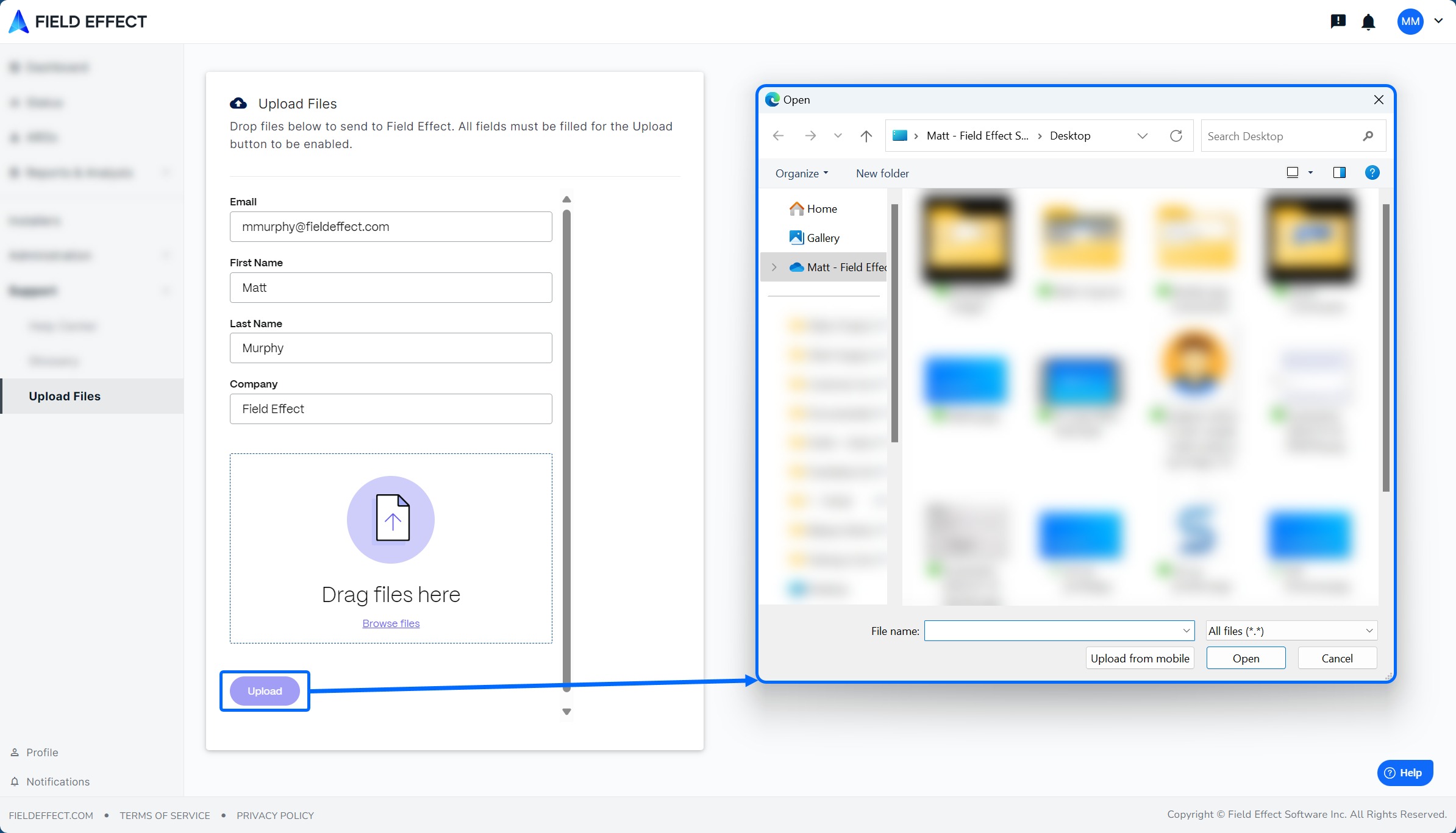 Pour éviter ces problèmes et ces pièges, vous pouvez partager des fichiers avec Field Effect directement à partir du portail MDR. Pour ce faire, accédez à la page Télécharger des fichiers de la section Support. À partir de là, vous pouvez fournir des détails sur vous-même et télécharger le fichier que vous souhaitez partager avec nous.